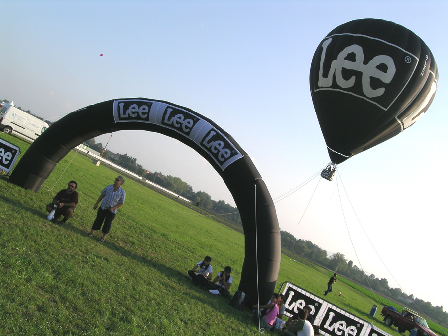 In alcuni casi, una sfera gonfiabile come elemento di richiamo visivo dell'evento può affiancare l'arco, rafforzando la riconoscibilità complessiva senza interferire con la funzione tecnica.