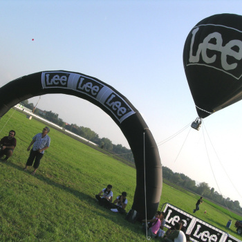 In alcuni casi, una sfera gonfiabile come elemento di richiamo visivo dell'evento può affiancare l'arco, rafforzando la riconoscibilità complessiva senza interferire con la funzione tecnica.